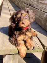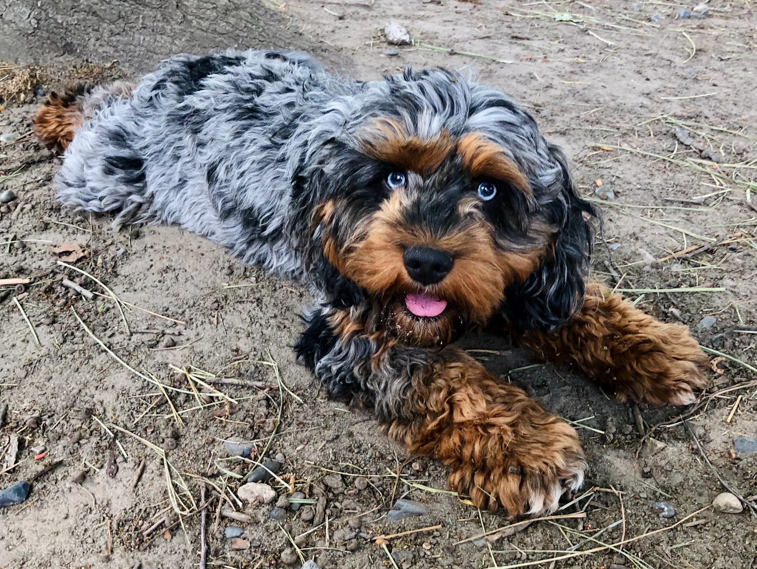Umami is a striking 20 lb. blue merle phantom mini Cockalier Poo. He turned one year old on July 21st 20204. We adore his captivating blue eyes! Umami is Japanese for perfect deliciousness, and he truly embodies his name! He's the perfect mix of Cocker playfulness, Poodle smarts and low shedding, and extremely easygoing, biddable, loving, and affectionate from the Cavalier. Excellent with children and other dogs and animals big or small. Crate trained, potty trained, leash trained. Confident around new dogs and strangers.